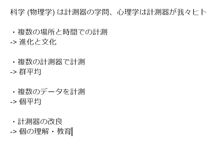 あとは、科学としての心理学や物理学との関係を考えました。キーワードは、計測器なのかなと思います。温度や磁気そのものは、ありそうだけどないものです。温度計や磁気計によって計測し、数値化やイラスト化して、実態がわかります。心理学で扱う心や意識は、構成概念で、この温度や磁気と同じものかもしれません。そして、私たち自身が計測器です。計測器が計測器を考えているから、さらにややこしいのかもしれません。